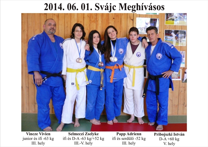 2014. június 1-én került megrendezésre Svájcban egy nemzetközi meghívásos verseny Diák „A” – Serdülő – Ifi – Junior kategóriákban. Szakosztályunk 4 főt indított, akik méltán helytálltak a nagy és erős nemzetközi mezőnyben. Többnyire III. és V. helyeket sikerült megszerezniük, igazi harcos küzdelmekben. Volt olyan versenyzőnk is, Vincze Vivien, aki két korosztályban is bronzérmet szerzett. Külön kiemelném Pribojszki István judoka küzdelmeit, aki a nagy létszám súlycsoportja ellenére az V. helyen végzett. Mindvégig bátran és kiegyensúlyozottan vívta meg küzdelmeit.
