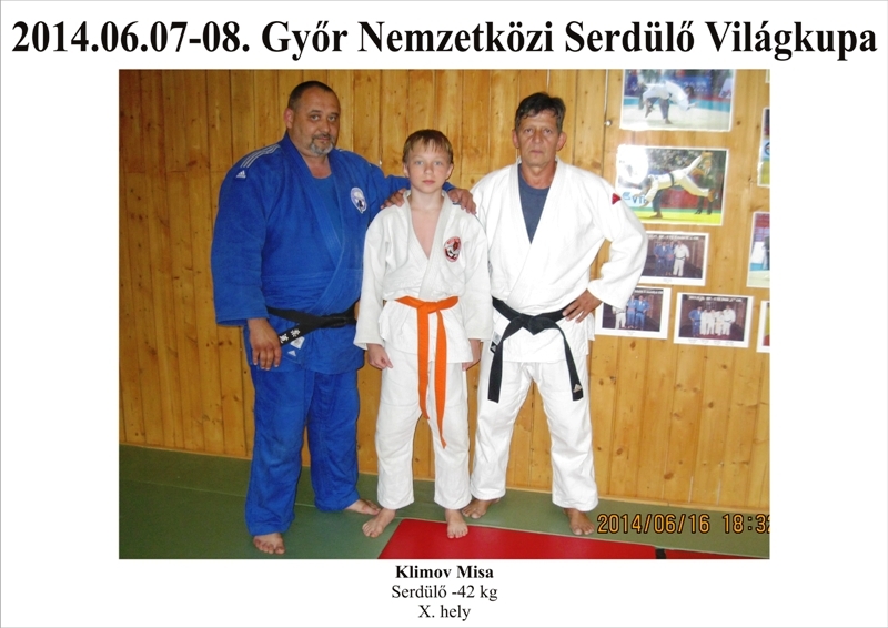 2014. június 7-8-án került megrendezésre Győrben a Nemzetközi Serdülő Világkupa. Ezen a versenyen szakosztályunk egy főt indított, Klimov Misa személyében, aki még csak Diák „A” korosztályos versenyző. Róla azt kell tudni, hogy nemrég lett tagja szakosztályunknak, de igencsak felkészült versenyző, mert előtte 6 évig Odessában koptatta a tatamit. Egy korosztállyal feljebb indítottuk ezen a versenyen, ahol harciasan küzdve a nagy létszámú súlycsoportjában a X. helyet sikerült kivívnia.