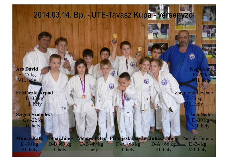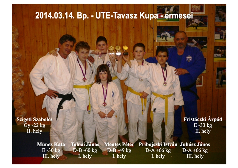 2014. március 14-én került megrendezésre Budapesten az UTE megyeri úti Judo csarnokában a meghívásos „Tavasz-kupa”. Ezen a versenyen szakosztályunkból 12 fő nevezett. Versenyzőinknek 7 db érmet és 5 db pontszerző helyet sikerült szerezniük. Gratulálunk neki, ügyesek voltak!