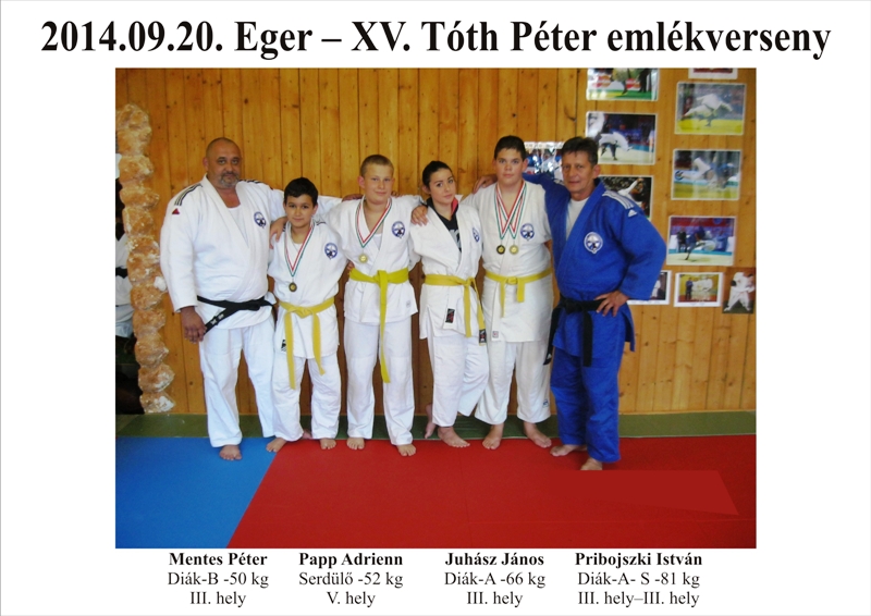 2014. szeptember 20-án Egerben került megrendezésre a XV. Tóth Péter Emlékverseny. A nagy létszámú résztvevőkhöz szakosztályunk is csatlakozott 5 fővel. Mind az 5 főnek sikerült kivívni érmes helyezést. Sok kiváló küzdelmes mérkőzést láthattunk tőlük, melyre edzőik nagyon büszkék. Megjegyezni kívánnám, hogy Mentes Péter III. helyezése nem tükrözi jól teljesítményét, hiszen négy mérkőzésből hármat megnyert, és egyet veszített. Mentségére legyen mondva, hogy a vesztes mérkőzést utoljára vívta eléggé fáradtan. Viszont akiket megvert, azok lettek az I. és II. helyezettek. Ez a körmérkőzéseknél fennálló probléma, amikor körbeverés van. Ilyenkor a mérkőzésen szerzett pontok aránya dönt a helyezésről. Teljesítménye alapján aranyérmet érdemelt volna.