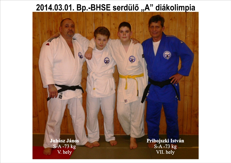 2014. március 1-én a Budapesti BHSE-ben került megrendezésre a Serdülő „A” Diákolimpia, melyen 2 főt indítottunk szakosztályunkból 73 kg-os súlycsoportban. Juhász János és Pribojszki István annak ellenére, hogy Diák „A” korosztályos versenyzők, szépen helytálltak az idősebb korosztály versenyzői között. Gratulálunk nekik!
