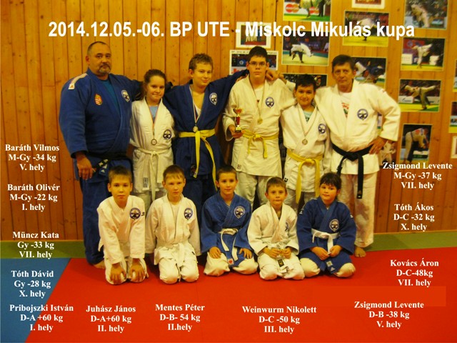 2014.december 5-én került megrendezésre az UTE-ban a meghívásos Mikuláskupa. Szakosztályunk 12 főt indított, a 12 főből 6 db érmet sikerült szereznünk és 4 db pontszerző helyet. A kezdő judokák első versenyesek lévén kimagaslóan jól küzdöttek, és éremszerző helyre verekedték be magukat. 2014. december 6-án került megrendezésre a meghívásos Mikuláskupa Miskolcon, melyen 3 fő képviselte a szakosztályt. Egy érmet és két pontszerző helyet sikerült elhoznunk. Gratulálunk nekik!