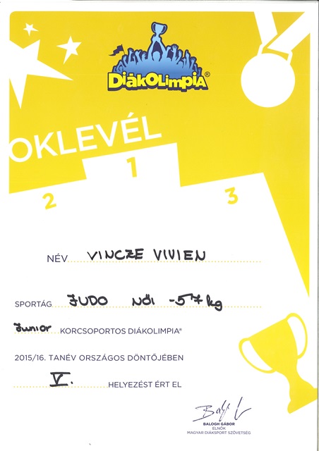 2016. június 11-én Tatán került megrendezésre a Junior Diákolimpia, amelyen -57 kg súlycsoportban V.helyezést ért el Vincze Vivien versenyzőnk, gratulálunk az elért eredményéhez!